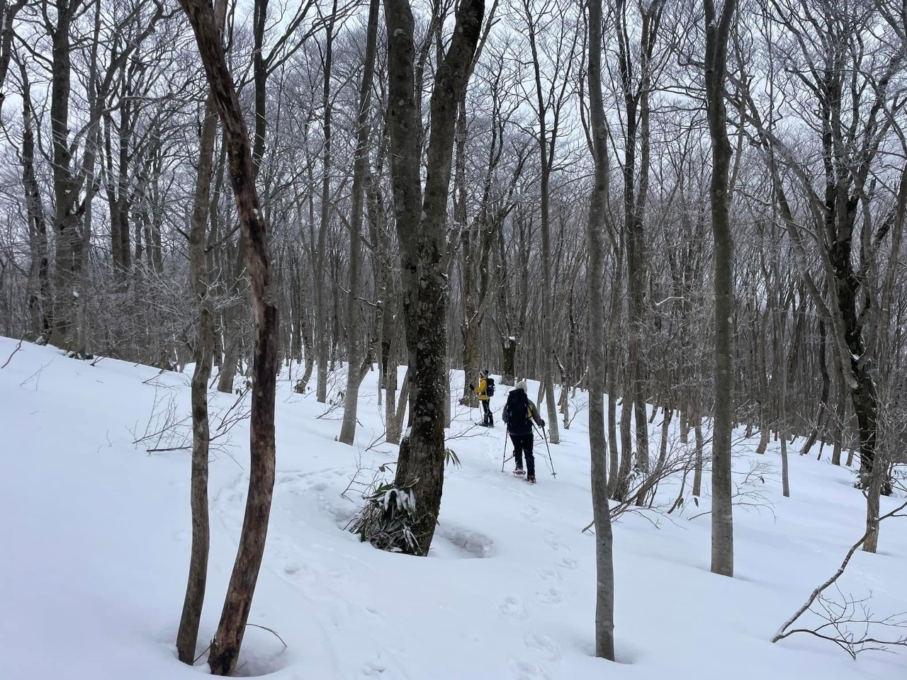 登山開始前の積雪のない景色が嘘のように思えるくらいの雪景色に囲まれ、登山道が見えず自分の足跡が道になっていく楽しさに心も躍ります。