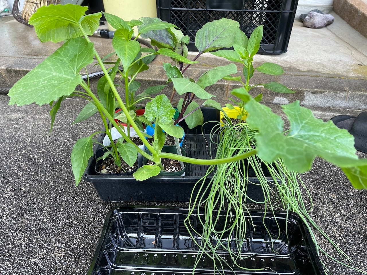 雨がないので、夫は野菜が枯れない程度にジョウロで水道水を与えます。