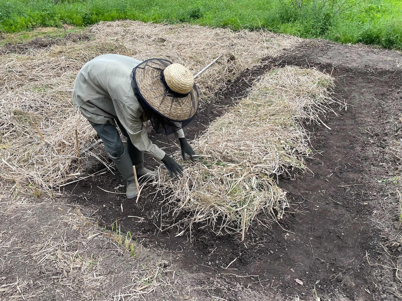 地表が乾燥するのを防いだり、日光を遮ることによって雑草が茂るのを抑制したり、枯れ草が畑の養分となる効果があるそうです。