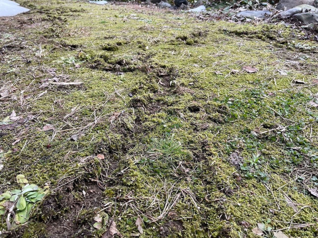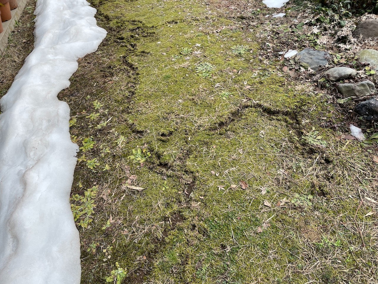 雪が溶けると、苔むした庭に不思議な紋様が。